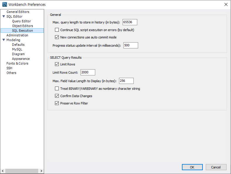 데이터 수 제한적 늘리기 : [Edit] - [Preferences] - [SQL Editor] - [SQL Execution] - Limit Rows Count 수정